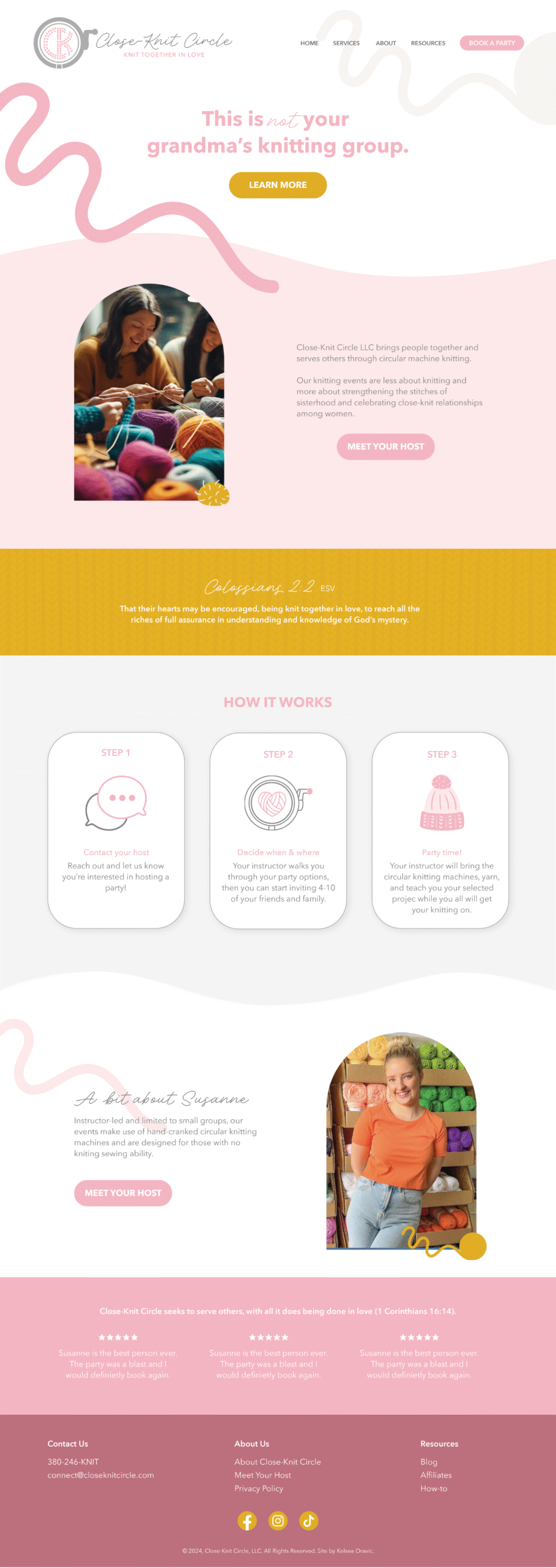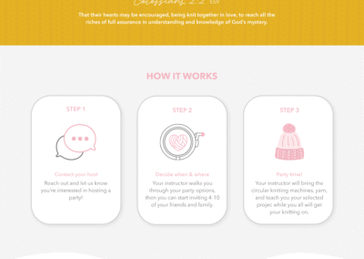 The identity blends the charm of handmade craft with the spirit of togetherness. Friendly typography, soft textures, and faith‑rooted messaging reinforce the idea of being “knit together in love,” capturing the heart behind the original vision. The experience is designed to feel approachable and nurturing, with small‑group, instructor‑led events that focus less on perfect technique and more on shared laughter, storytelling, and sisterhood.