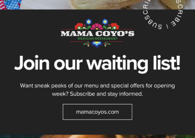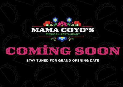 The black background sets a dramatic stage, allowing the vivid floral motif and taco illustrations to pop with personality. The stylized white “Mama Coyo’s” logo feels handcrafted and authentic, while the green “Mexican Restaurant” tagline adds a fresh, earthy contrast. The hot pink “Coming Soon” announcement injects excitement and urgency, signaling a brand that’s lively, confident, and ready to make a splash.