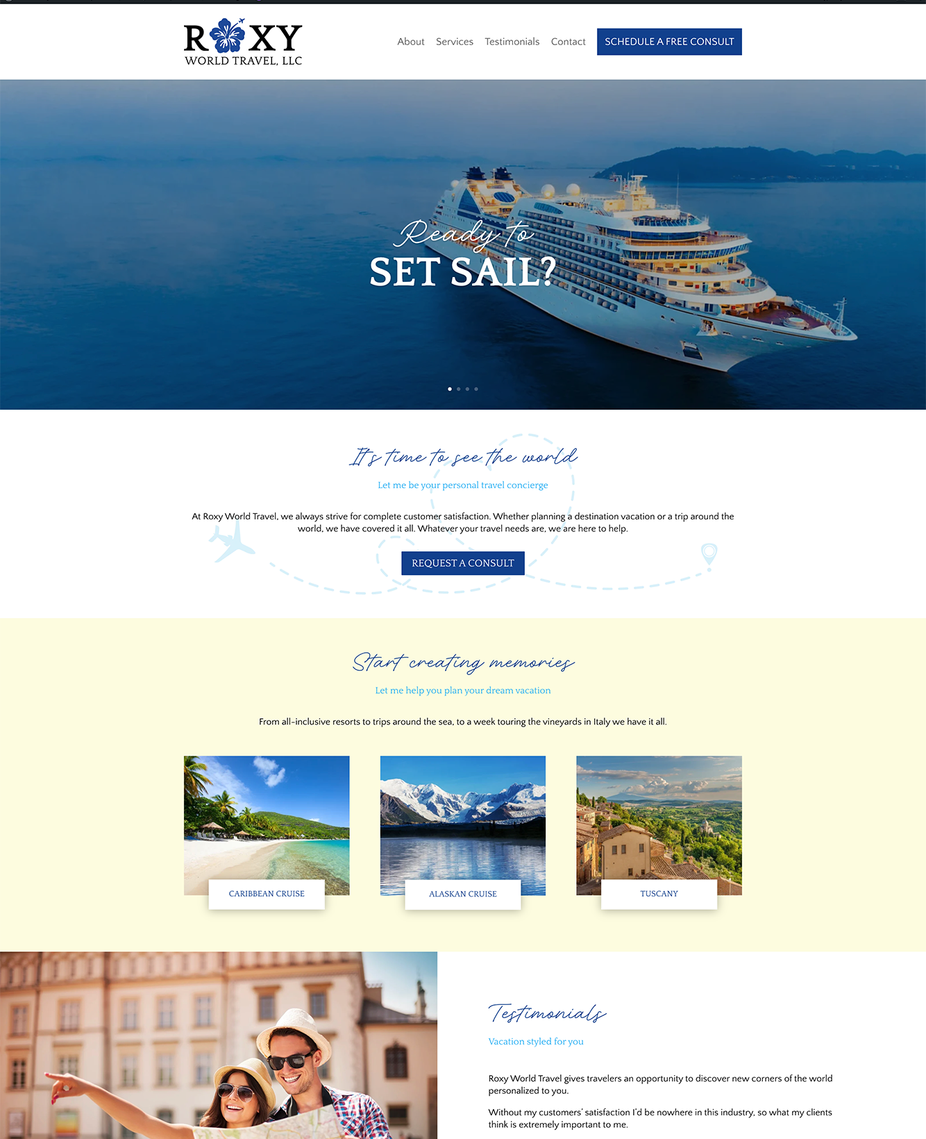 Roxy World Travel invites visitors into a world of effortless exploration, pairing warm, personal service with a clean, modern visual style. The design centers on clarity and calm—open layouts, spacious imagery, and a welcoming voice that reflects the brand’s role as a personal travel concierge. The homepage immediately sets the tone with bold, inviting statements like “It’s time to see the world” and a clear call to action that guides users toward planning their next adventure.